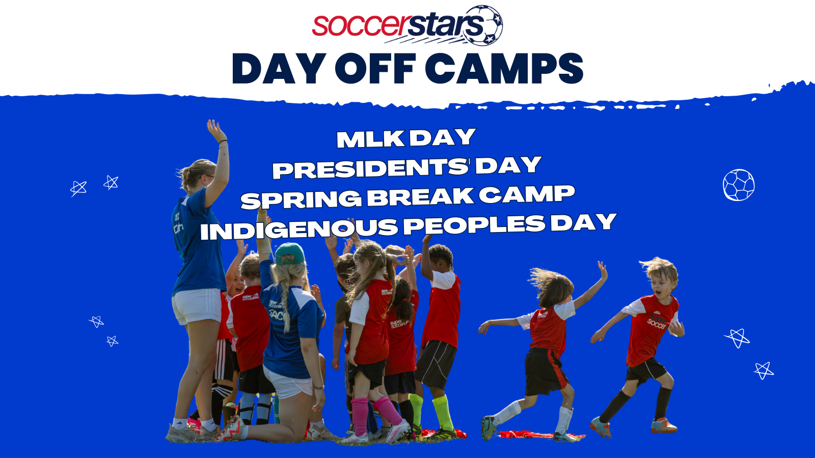 No school? No problem! Soccer Stars Day-Off Camps offer half-day and full-day options in a safe, supportive, high-energy environment. Kids stay active, have fun, and build real soccer FUNdamentals while learning and smiling all day long.